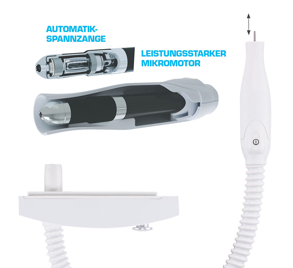 Durch die Automatikspannzange lassen sich die Bits schnell und einfach wechseln. Einfachste Reinigung / Desinfektion des Handstückes sowie des hochflexiblen Absaugschlauches.