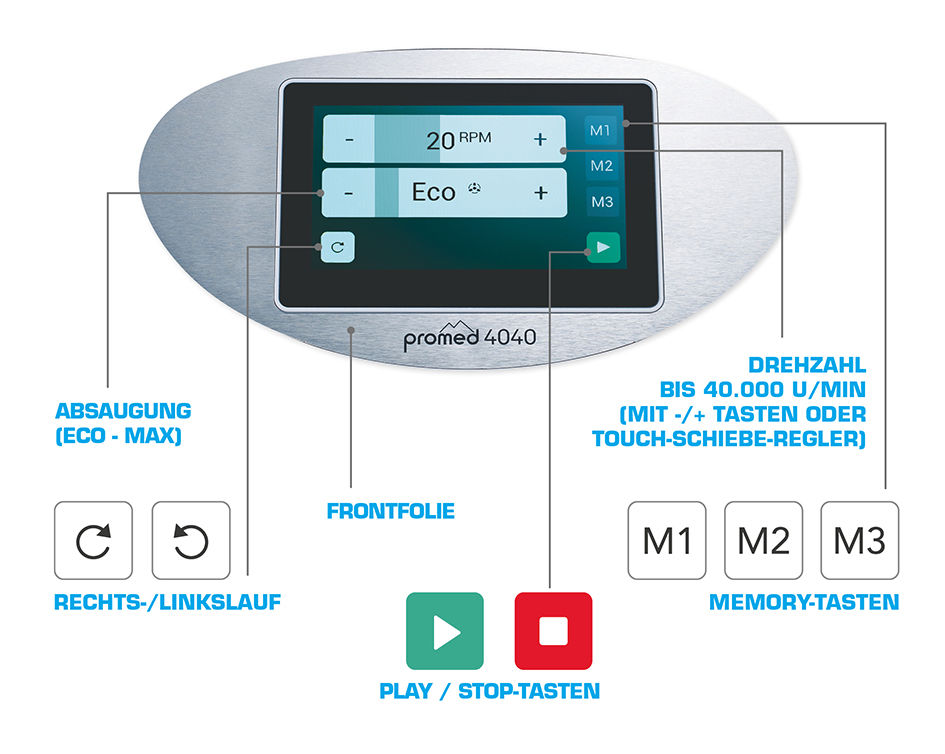 Der Micromotor im Handstück leistet bis zu 40.000 U/min. Die Stand-by-Taste garantiert ein schnelles An- und Ausschalten beim Arbeiten. Starke 360 Grad-Absaugung direkt am Fräser.